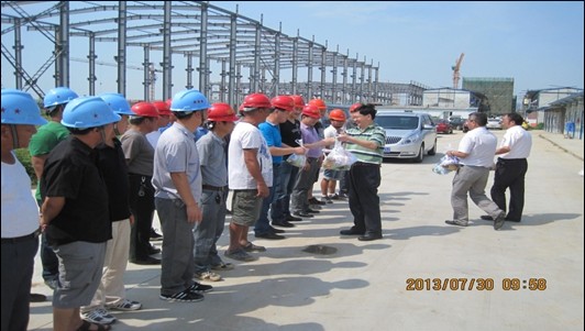 同樣,新廠工地建設(shè)者的安全問題、工程進度和質(zhì)量問題也是廠領(lǐng)導(dǎo)十分關(guān)心的大事。7月30日上午,冒著37度的高溫,廠長董風(fēng)林同志帶領(lǐng)王京洲、朱金玉、孫永泉等廠領(lǐng)導(dǎo)趕到位于江寧科學(xué)園的新廠建設(shè)工地,親切看望和慰問了工程隊的工人、工程監(jiān)理、項目跟蹤審計人員以及企業(yè)新廠建設(shè)辦的同志們,為他們帶去了企業(yè)的關(guān)心和問候,送去了慰問品。董廠長在詳細了解了工程進度情況以后,特別關(guān)注安全生產(chǎn)情況,實地檢查了工地的安全,并再三叮囑在場所有參與施工單位的同志,一定要注意安全,有針對性地組織安全大檢查,同時,做好防暑降溫工作,要確保施工安全、工程質(zhì)量安全、食品安全,保證按進度和要求完成工程建設(shè)周期。