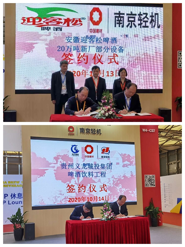 展會現(xiàn)場捷報頻傳,南京輕機與安徽迎客松啤酒就20萬噸新廠部分設(shè)備舉行簽約儀式,與貴州義龍城投集團就啤酒飲料工程簽約。盧黨軍、王欣等領(lǐng)導共同見證簽約儀式。今年10月新增訂單創(chuàng)歷史新高。來參觀的客戶一直絡(luò)繹不絕,受到廣大客戶的一致好評。