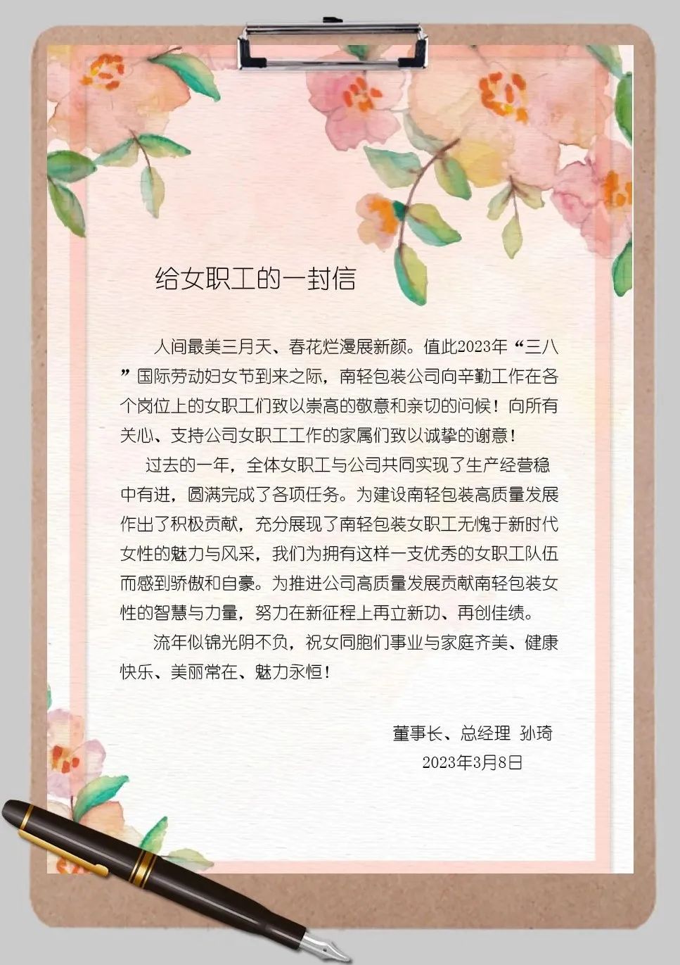 為弘揚(yáng)企業(yè)文化,彰顯人文關(guān)懷,在今年“三八”國際婦女節(jié)來臨之際,中國聯(lián)合裝備集團(tuán)副總經(jīng)理、南輕包裝公司董事長、總經(jīng)理孫琦為女職工發(fā)出了一封熱情洋溢的慰問信,勉勵(lì)大家立足崗位,鼓足干勁、不負(fù)韶華,為實(shí)現(xiàn)南京輕機(jī)高質(zhì)量發(fā)展再立新功。
